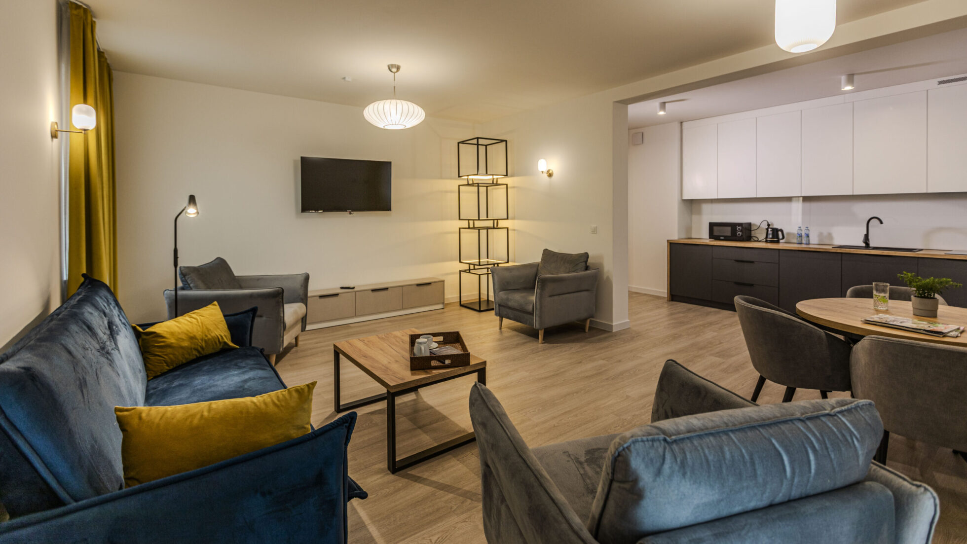 Sofa z rozkładanym łóżkiem dwuosobowym, duże fotele, stoliki kawowe, stół, TV z telewizja kablowa