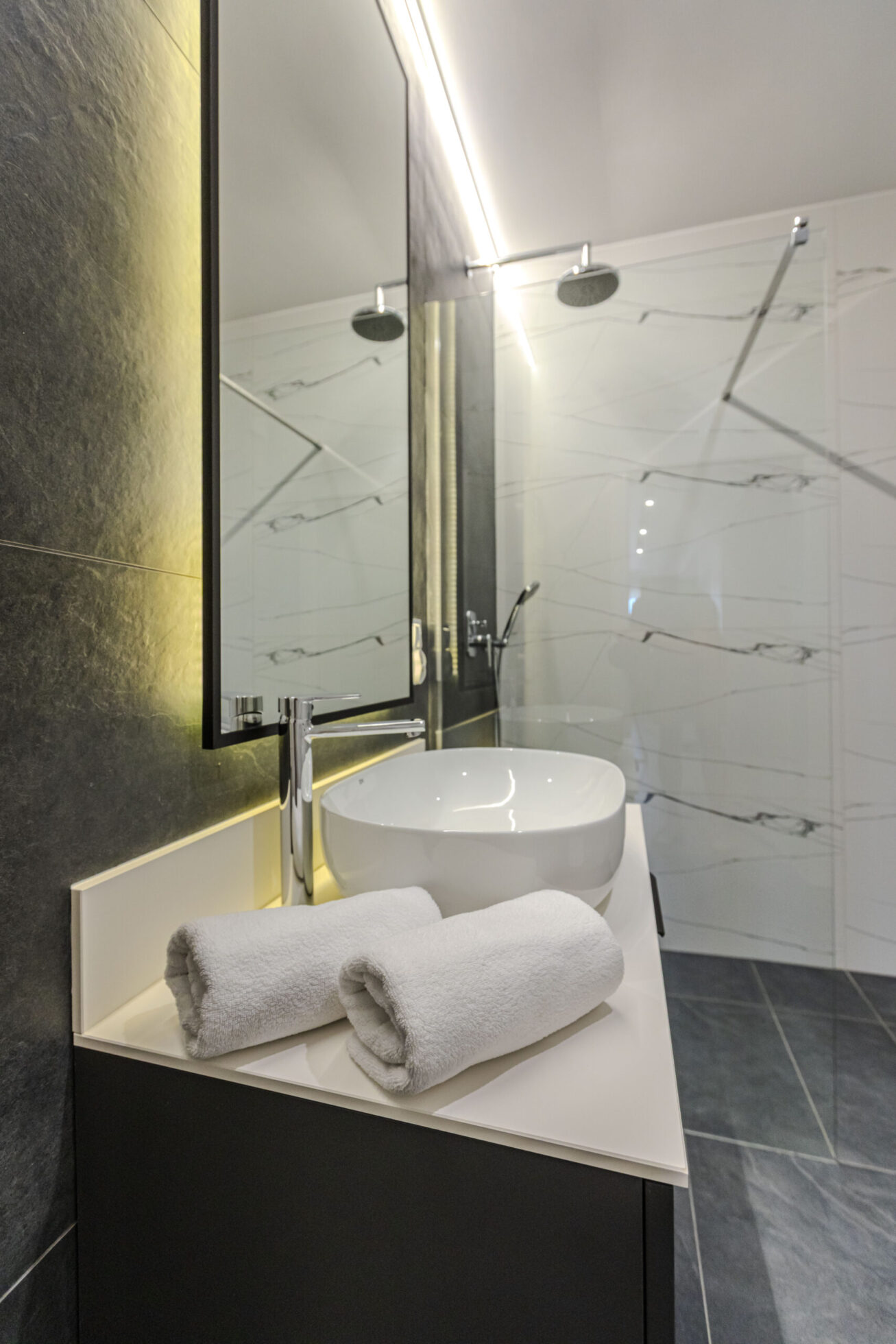 Łazienka wyposażona jest w kabinę prysznicową typu walk-in, z deszczownicą. Znajduje się w niej także WC, umywalka z szafką, ręczniki i komplet kosmetyków.