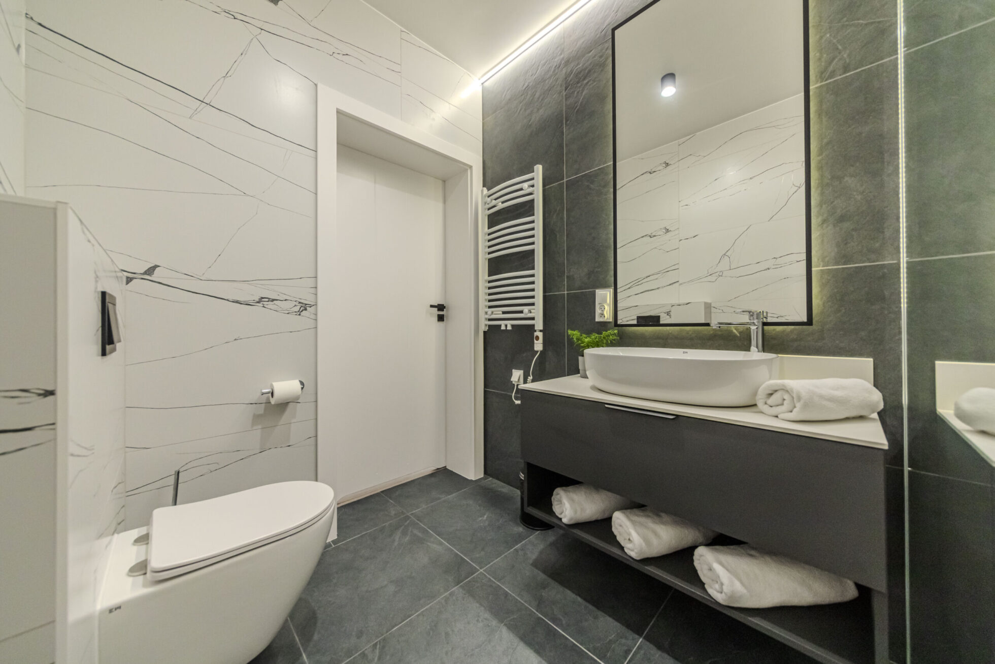 Łazienka wyposażona jest w kabinę prysznicową typu walk-in, z deszczownicą. Znajduje się w niej także WC, umywalka z szafką, ręczniki i komplet kosmetyków.
