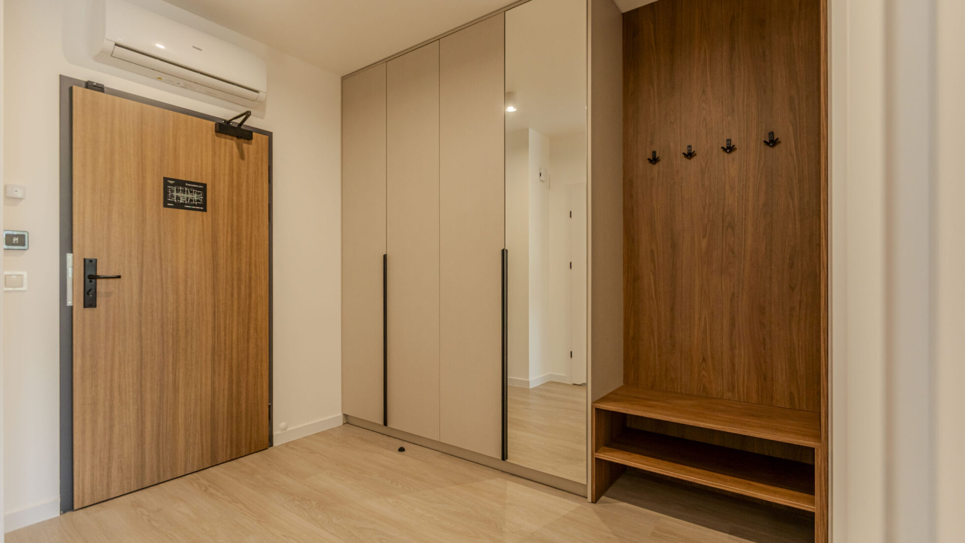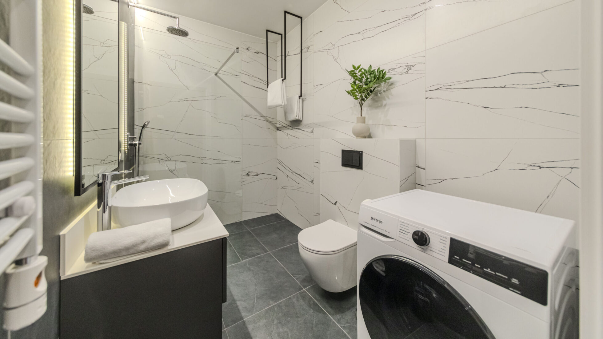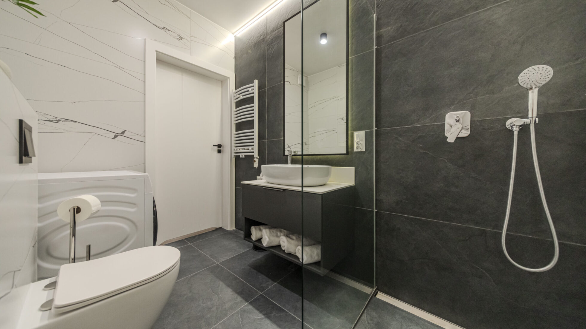Łazienka wyposażona jest w kabinę prysznicową typu walk-in, z deszczownicą. Znajduje się w niej także WC, umywalka z szafką, ręczniki i komplet kosmetyków.