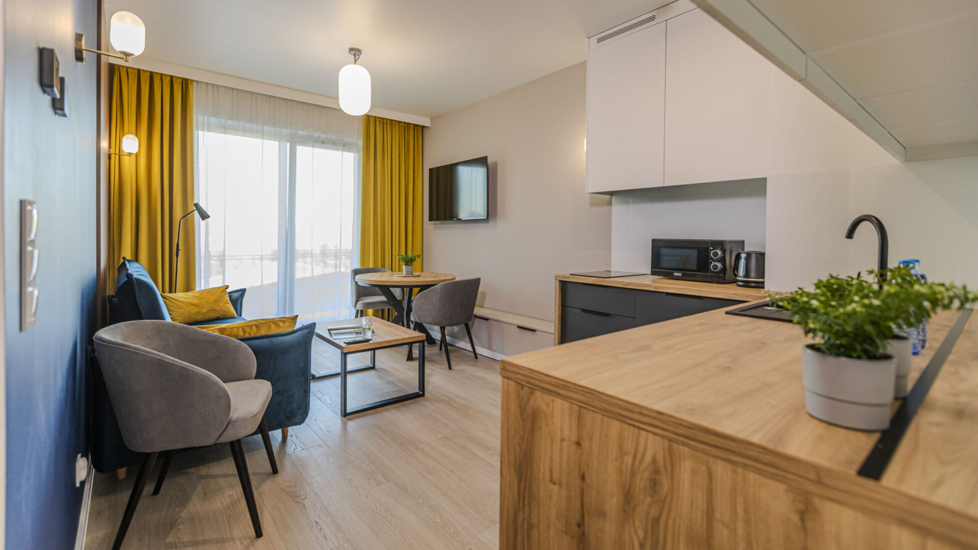 - kompletnie wyposażony aneks kuchenny i jadalnia