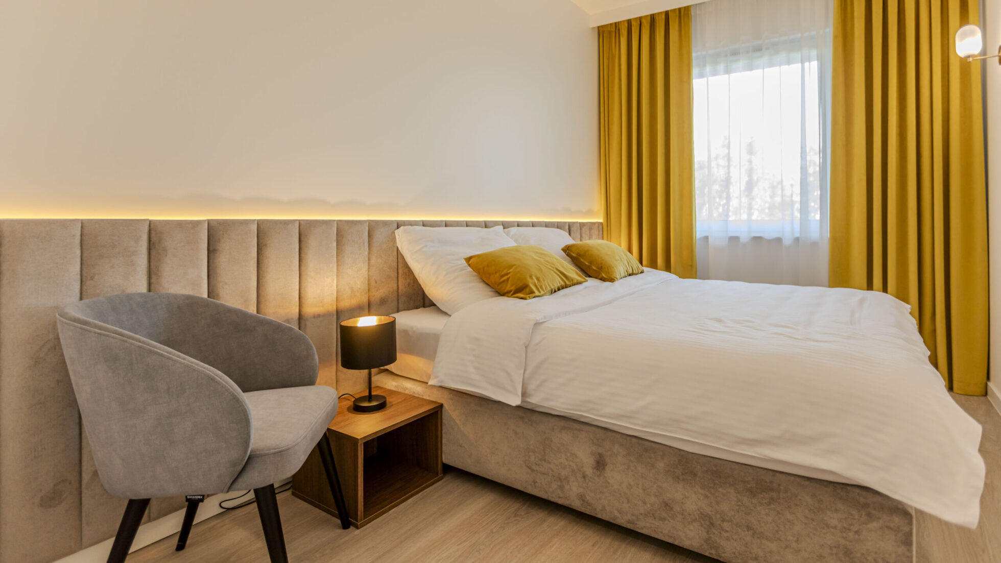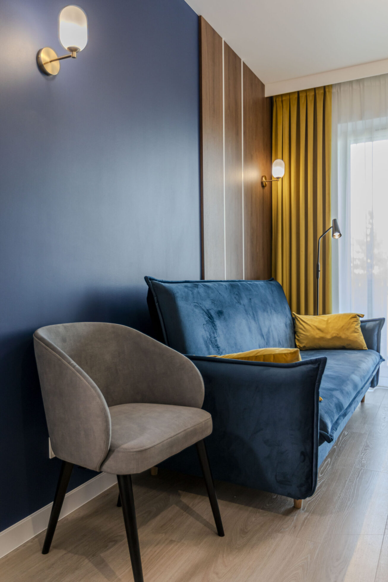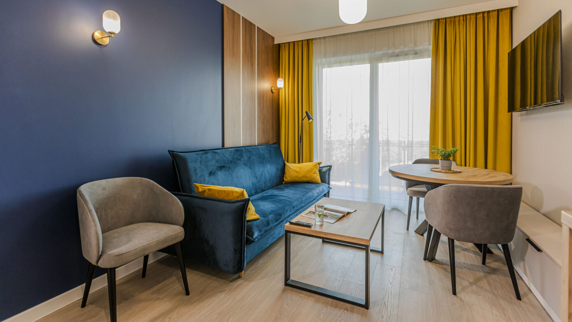 Sofa z rozkładanym łóżkiem dwuosobowym, duże fotele, stoliki kawowe, stół, TV z telewizja kablowa